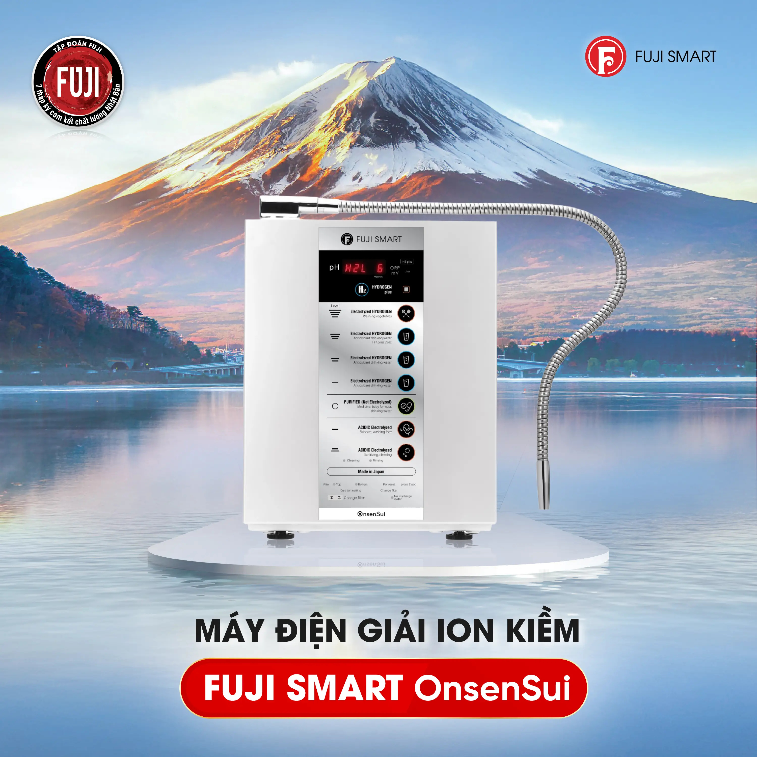 Fuji Smart OnsenSui không chỉ là chiếc máy lọc nước điện giải, mà còn là sự kết tinh giữa di sản Onsen nghìn năm và công nghệ y tế Nhật Bản hiện đại. Sản phẩm mang đến nguồn nước quý hiếm, giàu Hydro và khoáng chất, giúp chăm sóc sức khỏe toàn diện, an toàn và khác biệt vượt trội so với các dòng máy thông thường.